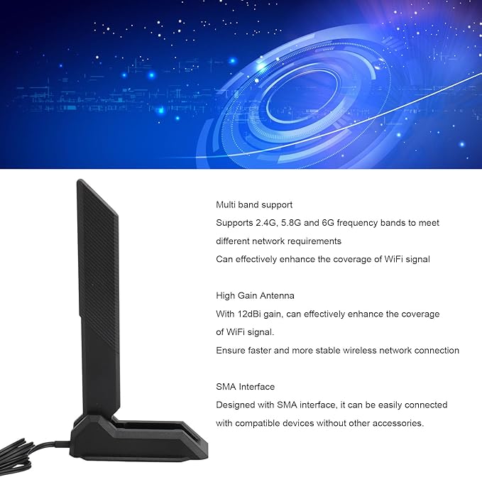 マルチバンドサポート:このWiFiアンテナは2.4G、5.8G、6Gバンドをサポートし、さまざまなネットワーク要件を満たし、WiFi信号のカバー範囲を効果的に強化できます。