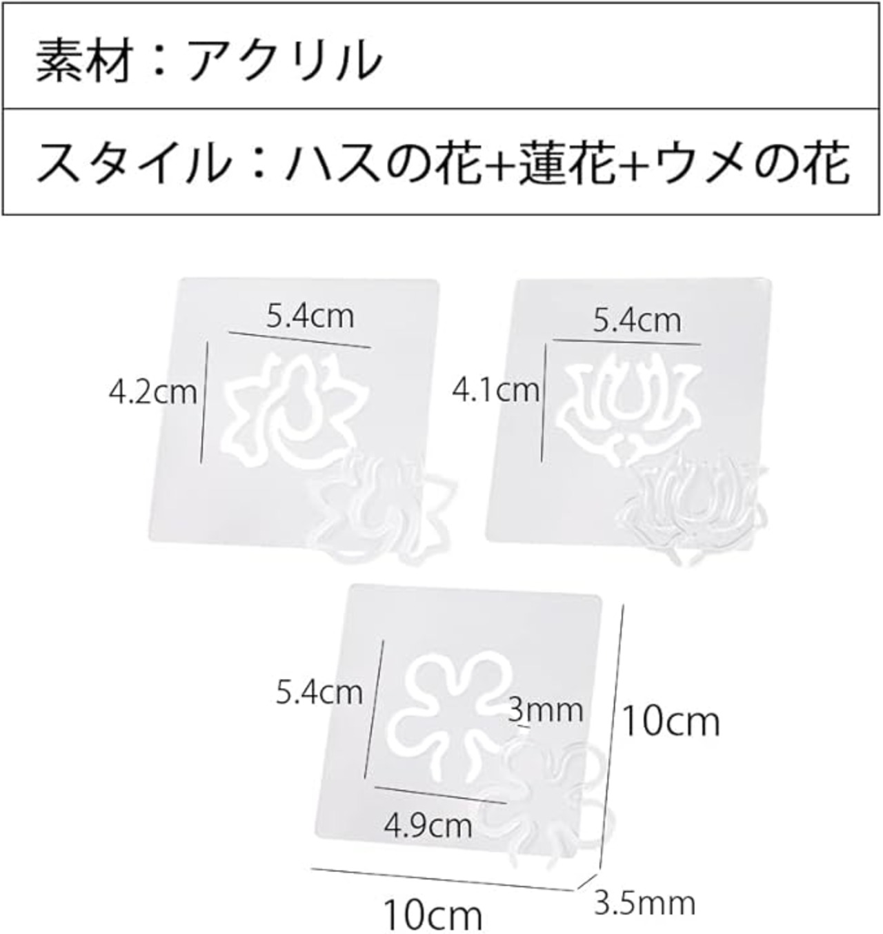 ●線香製造お香型、●素材:アクリル。●サイズ:アクリル型約10*10cm、線幅3mm、厚さ3.5mm。●スタイル:図柄サイズ。ハスの花:5.4*4.2cm。蓮花:5.4*4.1cm。ウメの花:5.4*4.9cm。