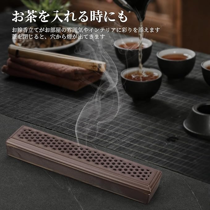 【製品仕様】製品サイズ:長さ24㎝ X幅5.4㎝ X厚さ3.4㎝ 本体重量:約450g ステンレスネットサイズ:長さ21.5cm X幅2㎝ お香の長さ:21.5㎝まで可能 素材:陶器 カラー:カフェ色