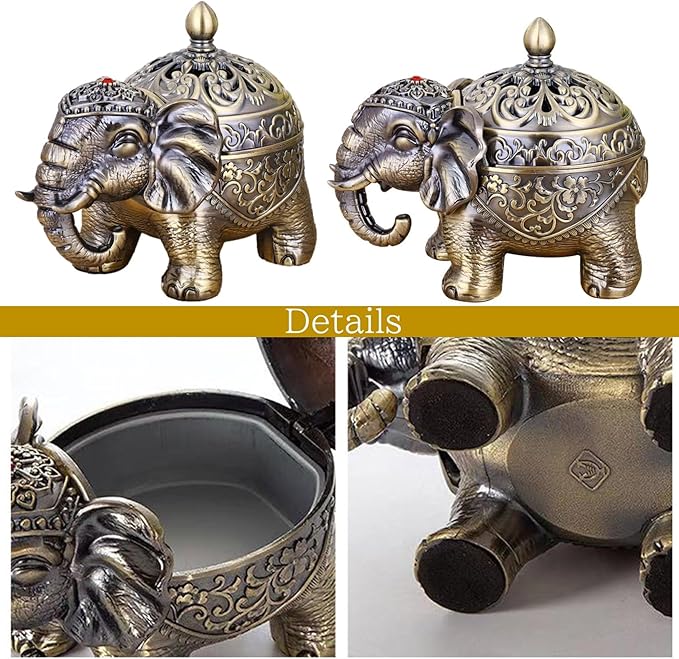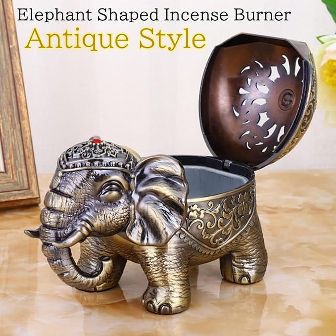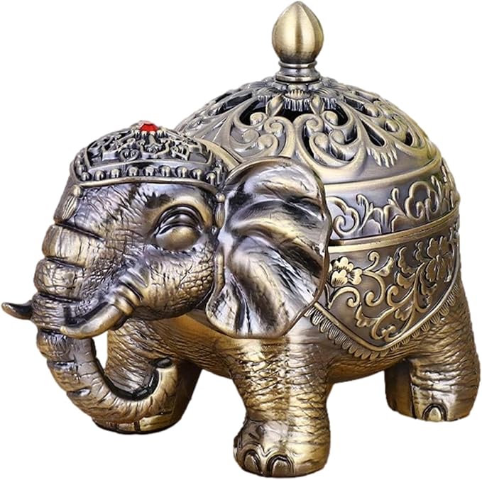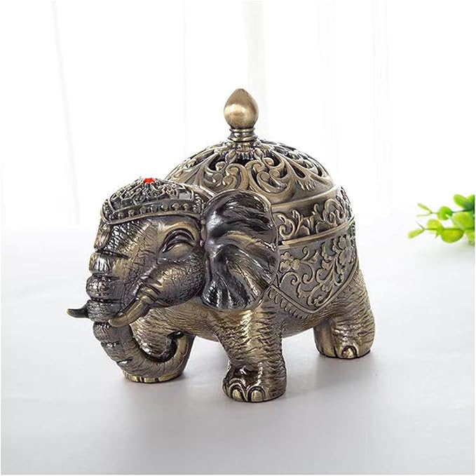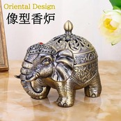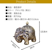 オリエンタルかつアンティークな趣のある象型の香炉です。亜鉛合金製で重厚感があります。「青古」調で色調も落ち着きがあり、手彫りの工芸品の様な風合いで空間と自然に調和するデザインです。イオンプレーティング加工で耐久性に優れており、エッジは滑らかで手触りは良く手を傷つけることはありません。 ※入荷時の製造ロットによって、頭頂部の赤い装飾部分の色が変わりますので、予めご了承ください。