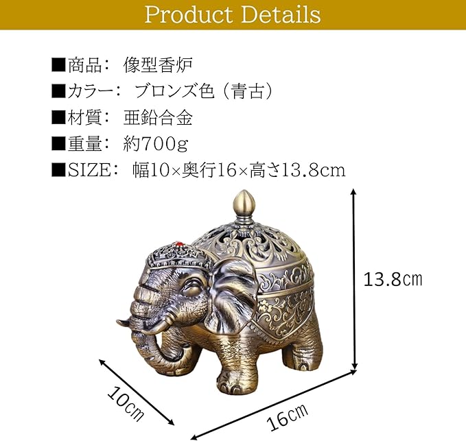 【サイズ】高さ : 13.8㎝ 幅 : 10㎝ 奥行 : 16㎝【重量】約700g 【材質】亜鉛合金 お香を焚く際は周りに引火し易い物がないか、お子様やペットの火傷にもご注意下さい。又、換気に注意してご使用をお願い致します。 モニター環境等の要素により、色の見え方に若干差が生じる場合がございます。予めご了承ください。