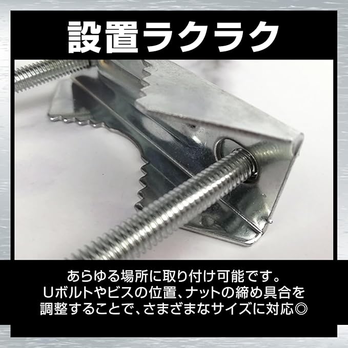 【設置ラクラク】付属の専用パーツ(L字型パーツ、専用ビス、クランプ)であらゆる場所に取り付け可能です。Uボルトやビスの位置、ナットの締め具合を調整することで、さまざまなサイズに対応◎
