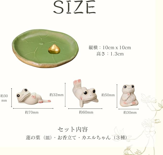 【商品仕様】セット内容:カエルちゃん3種類・蓮の葉皿・お香立て サイズ 合掌カエル:約30mm 50mm うつ伏せカエル:約60mm 32mm 横向きカエル:約70mm 30mm 蓮の葉(皿):約10cm 10cm ※モニターの環境により、色の見え方に若干差が生じる場合がございます。※上記の数値は、実測によるものです。多少の誤差はご容赦ください。
