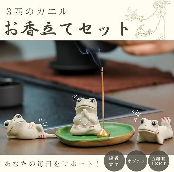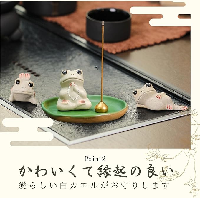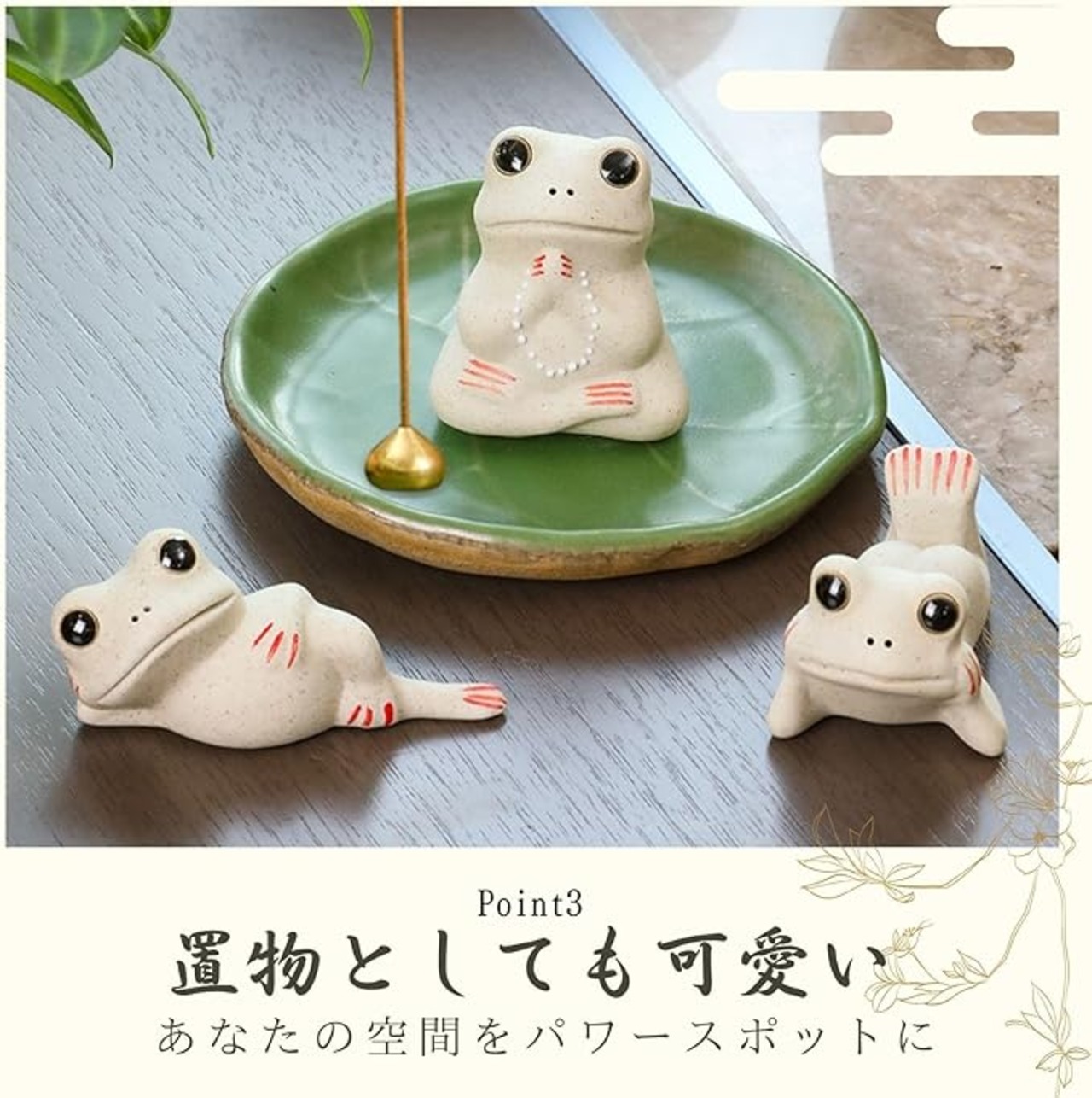 【インテリアとしても】お香立てとしてだけではなくインテリアとしてもオススメです!かわいい3匹のカエルちゃんに癒されて下さい。玄関・リビング・寝室・トイレどこでもマッチします。
