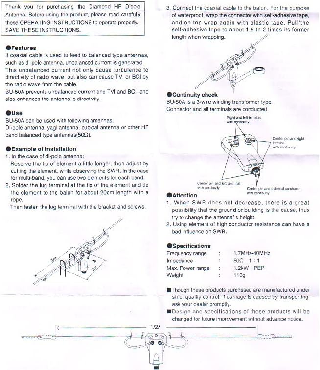周波数:1.7~40MHz●インピーダンス:50Ω(1:1)●耐入力:1.2KW(PEP)●接栓:M-J