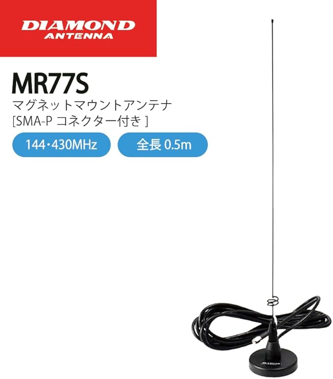 ●周波数:144/430MHz帯●耐入力:70W ●重量:400g ●利得:3.4dBi(430MHz)●形式:1/4λ(144MHz), 5/8λ(430MHz) ●SWR:1.5以下●全長:約0.5m●同軸ケーブル:RG58C/U4m、SMA-Pコネクター付●インピーダンス:50Ω ●空中線形式:単一型 レピーター対応型