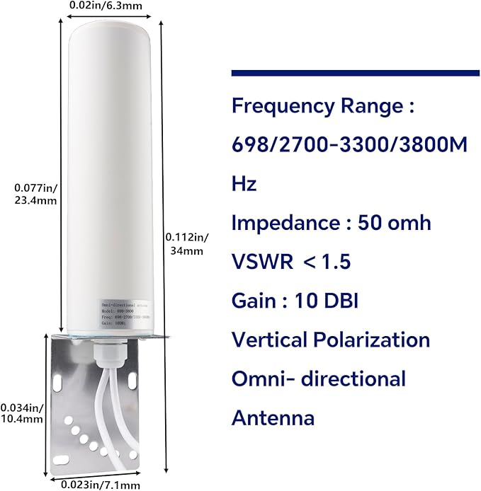 【商品詳細】:無指向性屋外用4Gアンテナ、アンテナ高利得:10-12dBi、周波数範囲:698-2700、3300-3800MHz、サイズ:23cm*6.5cm