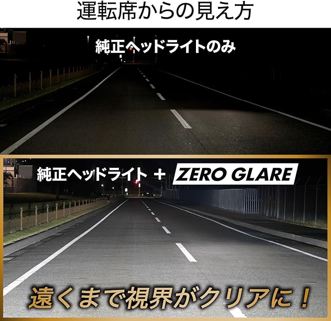 対向車への眩惑を抑える配光設計。ゼログレアは、意匠権取得済みの他社に真似ができない配光設計により、対向車や歩行者への眩惑を最小限に抑えています。これにより、他の道路利用者への配慮が行き届き、交通事故のリスクを低減します。ドライバー自身も、他者からのクレームやトラブルを避けることができ、ストレスの少ない運転環境を実現します。