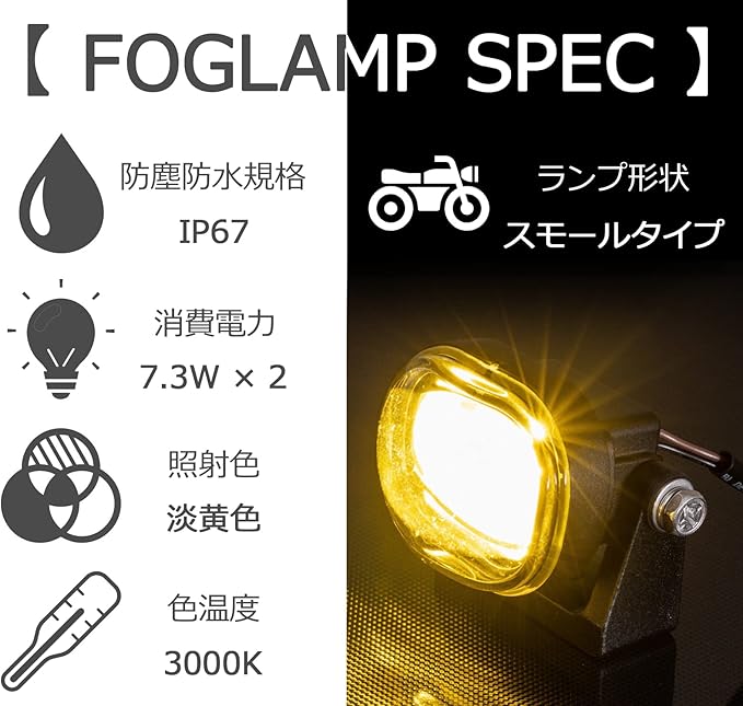 タイプ:スモールタイプ / 消費電力:7.3W 2 / 防塵防水規格:IP67 / 照射色:淡黄色 / 色温度:3000K