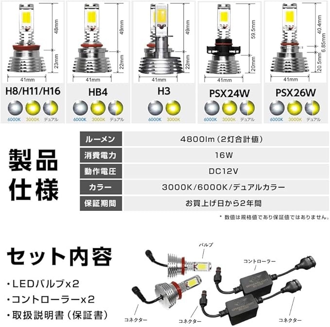 【スペック】LEDバルブ 形状:H8、カラー:デュアルカラー(2色切り替え、ホワイト/イエロー)、明るさ:4800lm(2灯合計値)、対応電圧:12V、入数:2本、保証期間:2年、冷却方法:ヒートシンク(ファンレス)、寿命:20000時間