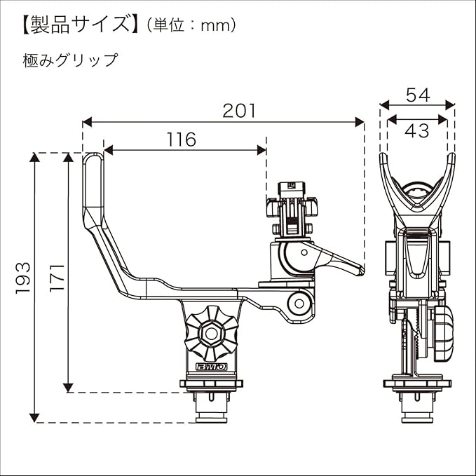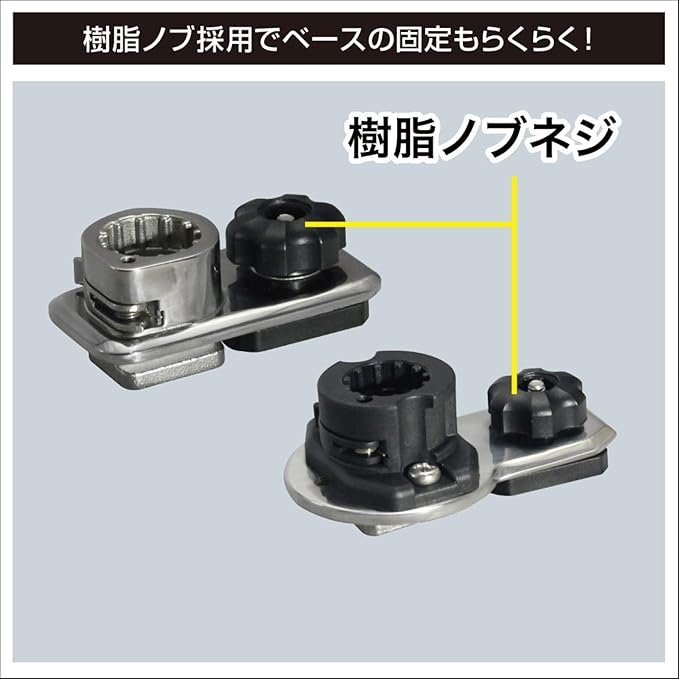 極みを超えた最高峰のロッドホルダー! 様々なロッド径に対応できる3サイズのヘッドバンド付きです。ロッドの首振り角度や左右の回転が自在にできる構造になっています。セットした状態でしゃくり動作もラクラクでき、手元のリリースレバーでロッドの取り外しも瞬時に行うことができます。ステップレール用ベースとロッドホルダーのセットです。ステップレールをお持ちの場合はこちらのセットで使用可能です。ギア付シャフト部にノブを採用したことにより、ノブを締めればベースとアタッチメントとの固定力がアップし、ガタつきの軽減を実現しました。ベースを取付する際のノブネジが樹脂製になったので、取付時の締め込みが工具不要で簡単にできます。※ロッドの落下を防ぐために必ず尻手ロープをご使用ください。