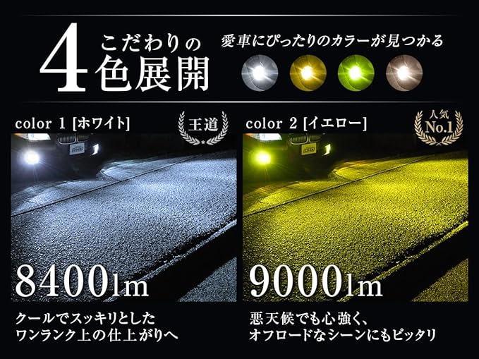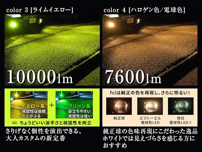 エフシーエルの最強ルーメン h8 h9 h11 h16 hb3 hb4 h1 h3 h3c h7 led ヘッドライト レジェンダリーシリーズ。人気のハイエース200系、セレナ C27、30プリウスやアクアなど多くの車へ交換可能。ハロゲン球と比べて10倍以上、hidを超える明るい車検対応のledバルブ。ただ明るいだけでなく、点灯直後から安定するまでほとんどルーメン数が下がらず、時間が経っても最高の明るさを維持します。ロービームやハイビーム、フォグランプに取付が可能で、カラーはイエロー、ホワイト、ライムイエロー、電球色 (ハロゲン色/暖色)の4色からお選びいただけます。※一部バルブ形状では取り扱いのないカラーがあります。