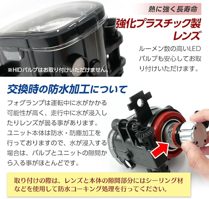 【交換時の防水加工について】フォグランプは運転中に水がかかる可能性が高く、走行中に水が侵入したりレンズが曇る事があります。お取り付けの際はレンズと本体の間の隙間部分にシーリング材などを使用して防水コーキング処理を行ってください。