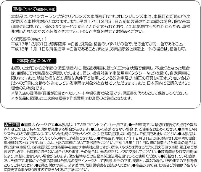 <装着不可車種>本製品は、ウインカーランプがクリアレンズの車両専用です。オレンジレンズ車は、車幅灯点灯時の色度が要因で車検非対応となります。また、平成17年12月31日以前に製造された車両の場合、保安基準 (車幅灯)において、下記の通り同一色であることが定められており、これに抵触する恐れがあるため、車検非対応となりますので装着できません。