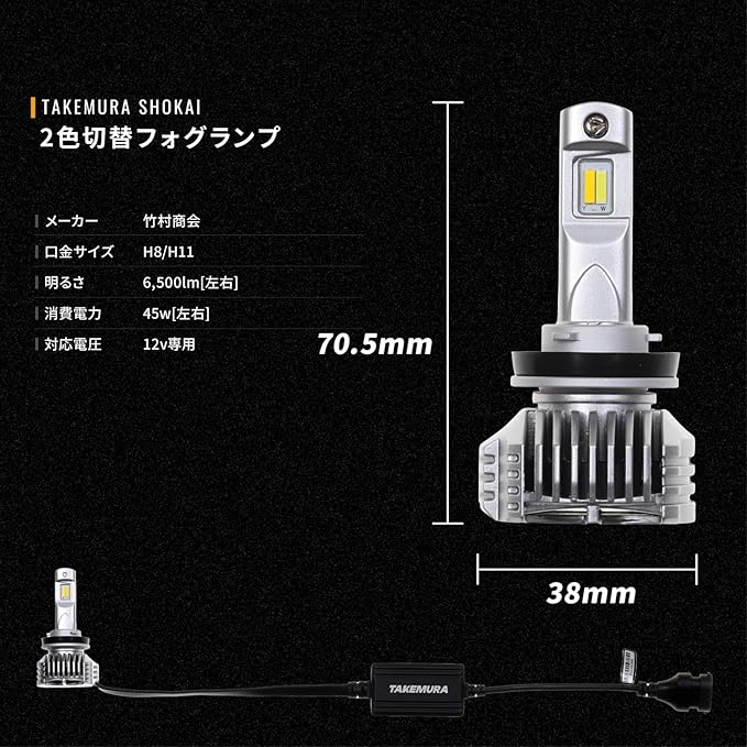 ✅商品詳細 【メーカー】竹村商会 【口金サイズ】H8/H11 【明るさ】6,500lm(左右) 【消費電力】45w(左右) 【対応電圧】12v専用 【極性】無極性 【入り数】左右セット