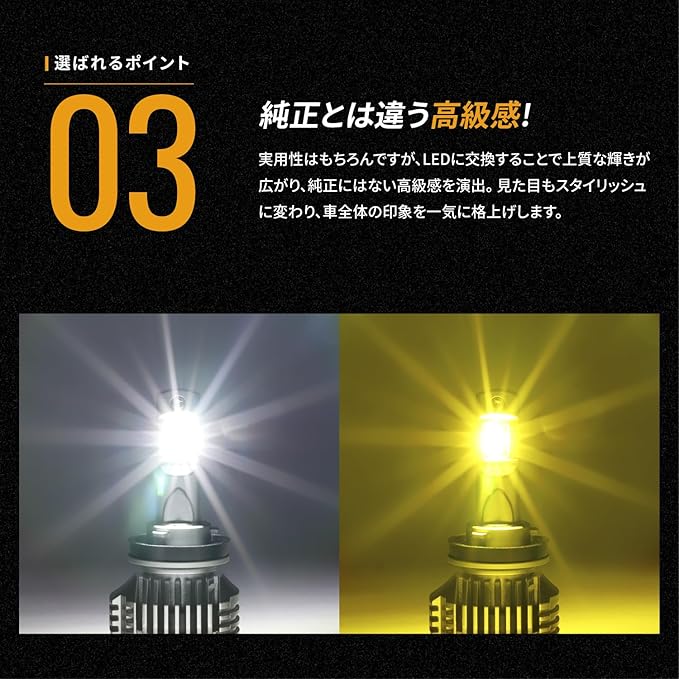 ✅【純正とは違う高級感】 実用性はもちろんですが、LEDに交換することで上質な輝きが広がり、純正にはない高級感を演出。 見た目もスタイリッシュに変わり、車全体の印象を一気に格上げします。