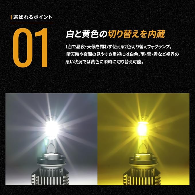 ✅【白と黄色の切り替えを内蔵】 1台で昼夜・天候を問わず使える2色切り替えフォグランプ。 晴天時や夜間の見やすさ重視には白色、雨・雪・霧など視界の悪い状況では黄色に瞬時に切り替え可能。