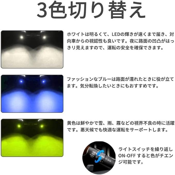 3色切り替え: オンオフを繰り返すことで色を変えることができます。 明るい白色: LED が長距離を照らし、対向車を見やすくします。 夜間でも道路の凹凸がはっきりと確認でき、安全運転を確保します。 スタイリッシュブルー:スタイリッシュブルーは路面が濡れているときに便利です。 気分を変えたいときにもおすすめです。 黄色のライト: 非常に明るく、視界が悪い場合 (雪、雨、霧など) に役立ちます。 悪天候時でも快適なドライブを実現します。