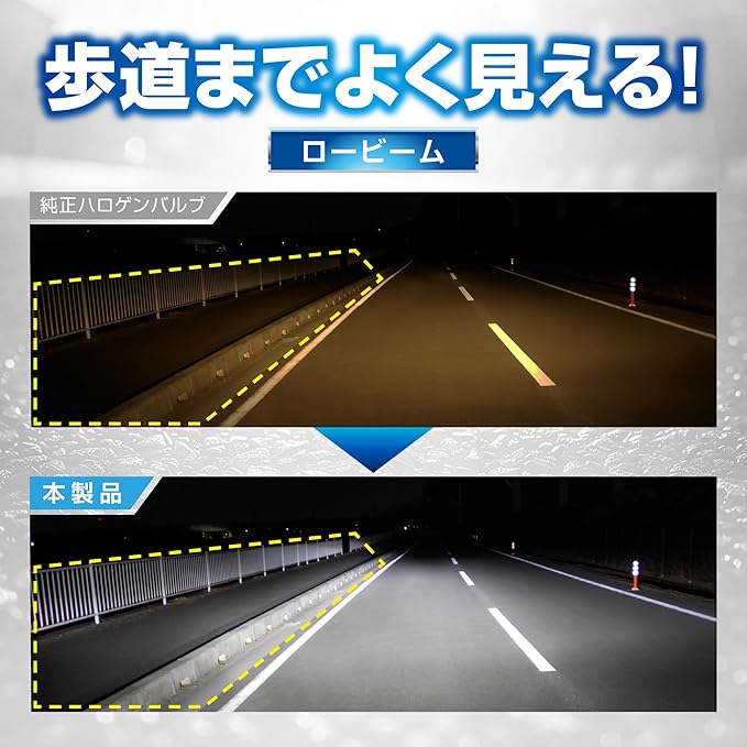 従来のLEDチップにありがちな明るさのムラを最小限に抑制、均一に路面を照射し明るさと共に見やすさも大幅に向上。夜間のドライブを強力にサポート。(※)当社測定値