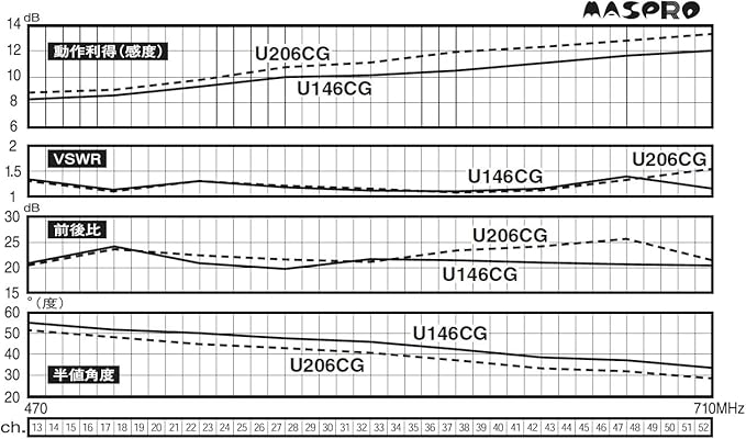 マスプロ電工の耐食性UHFアンテナは、高性能な20素子タイプのアンテナです。受信チャンネルはch.13~52に対応し、8.5~13.7dBの動作利得を実現します。水平・垂直両方の設置に対応可能で、マスト径22~48.6mmに適合します。DHマークを取得し、RoHS基準にも準拠した環境配慮設計となっています。設置時の利便性を考慮し、5C用F型コネクターが1個付属しています。耐食性に優れた設計で、長期間の屋外使用にも適しています。