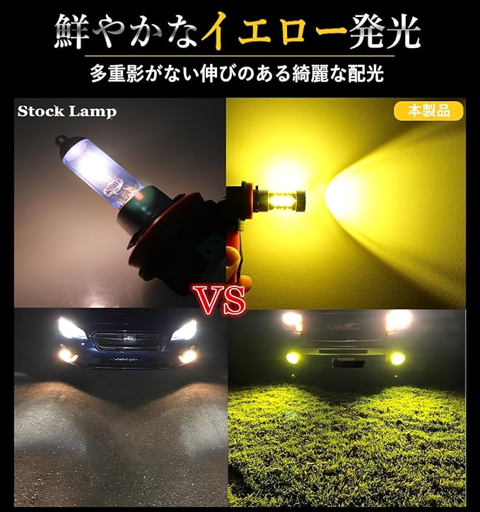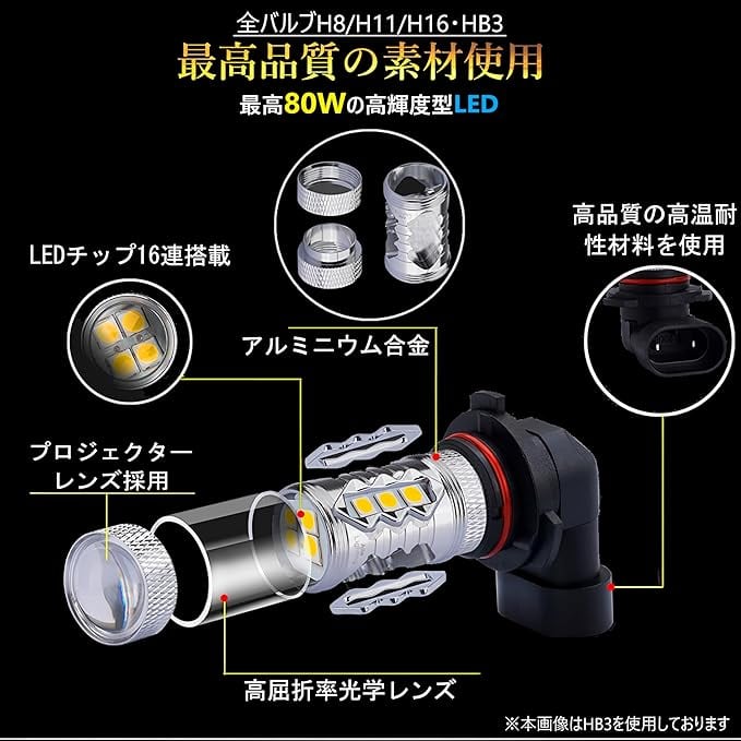 【商品規格】 ●タイプ : H8H11H16・HB3 LEDバルブ 2個 ●色温度:3500K(イエロー) ●ルーメン:2400LM ●LED数量:3030LED素子16個/1バルブ ●視野角:360 ●対応電圧:12V-30V ●消費電力:70W ●使用寿命:50000時間 ●車検対応