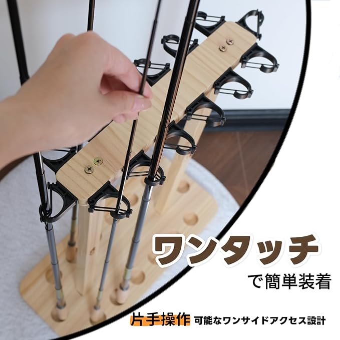 【パイン材採用】無垢材ならではの温もりある風合いが、畳の和室や玄関など、住空間に美しく調和。軽量設計でありながら高い耐久性を実現し、釣り竿の収納・片付けを格段に快適に。自然素材が醸し出す上質な雰囲気は、リビングルームに飾っても絵になる美しさです。