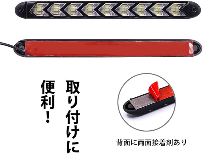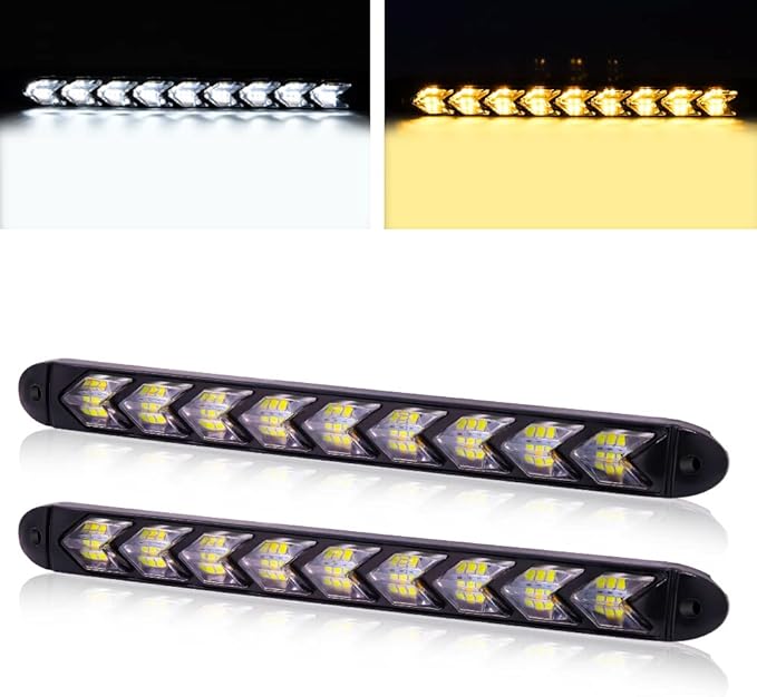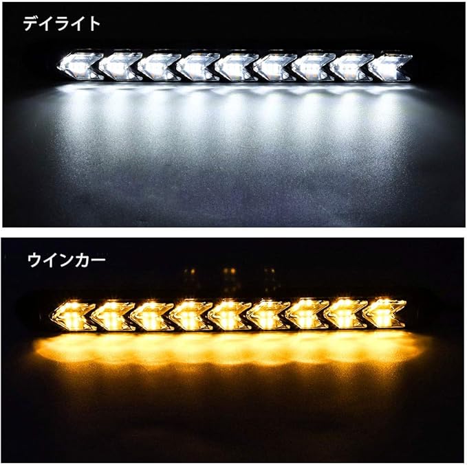 ★【超高輝度】本デイライトセットは1本あたり、9個の2色LEDを搭載し、高輝度、低消費電力です。デイタイムランニングライト用の白色LEDライトと、ターンシグナルライト用の連続点滅(フローモード)オレンジ色のLED。