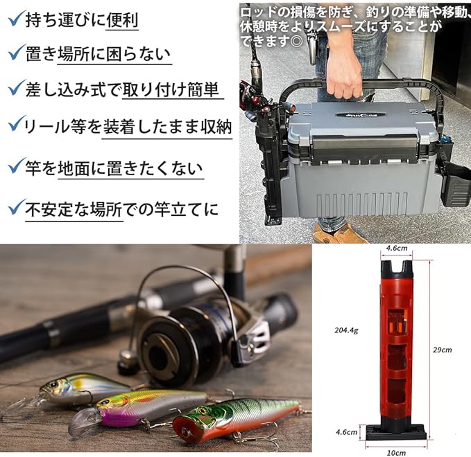 【製品サイズ:省スペース設計でどこにでも置ける】 全体の高さは約25cm、安定感のあるスクエアベース部分は幅・奥行き共に約10cmと、非常にコンパクトな設計です。デスクの上や本棚の一角、玄関のわずかなスペースにもすっきりと収まります。リールをロッドに装着した状態でも安定してディスプレイできるため、翌日の釣行準備やメンテナンス後の保管にも最適です。見た目の美しさだけでなく、限られた空間を有効活用できる実用性も兼ね備えています。