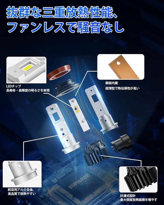 「優れた放熱システム フォグランプ led」バルブの寿命は、もちろん使用時間や使用環境によっても異なりますが、大切なのは「放熱構造」です。こちらの h11 led フォグランプ・h8 led フォグ・h16 led フォグランプは、航空用アルミニウムを採用し、凹溝式設計最大限度放熱面積を増やします。更にh11 led は超薄型の銅板を内蔵し、熱伝導性がより高くなって、放熱性能は大幅にupさせます。三重熱発散システムで、高温にも耐えられる非常に優れた耐熱性・放熱性を実現、30000時間以上の長寿命を保証します