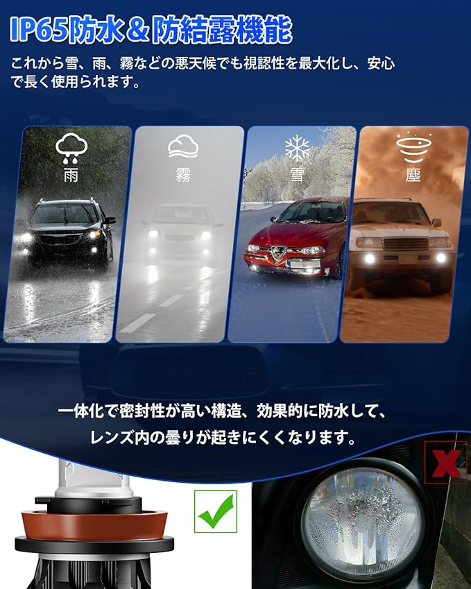 「結露対策済み h11 led」こちらのh8 led フォグ 爆光 はh11 led フォグランプとh16 led フォグランプとして使用できます。本体部には一体化で密封性が高い構造、二重の防水リングと厚手のゴム材料が採用されており、フォグランプの曇り現象を効果的に防止でき、レンズ内の曇りが起きにくくなります。また、無極性設計で、極性問題も解消されます