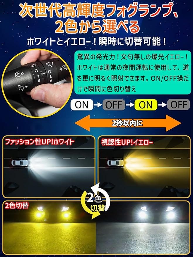 【製品仕様】日本車専用のサイレンサーを内蔵し、ラジオやナビへの干渉をゼロにしています。始動時や走行中でもFM放送を安定して受信できるので、快適でノイズのないドライブを楽しめます。本製品はIP68防水・防塵で、雨や雪の日でも明るさを維持できます。H8 H11 LEDフォグランプ、高効率CSPチップを採用、DC12Vモデルに適用、色温度:3000K(イエロー)6500K (ホワイト)は雨や雪、霧などの悪天候に適し、高い視認性を持っています。とても簡単で便利です!安全度が上がる!※デュアルカラー切替 保証期間内に万が一不具合が生じた場合は、販売店までご連絡ください。