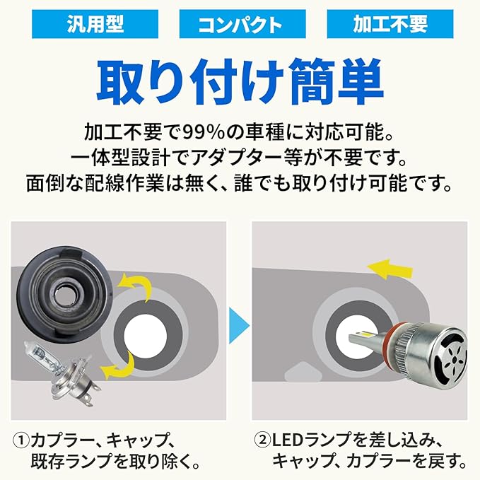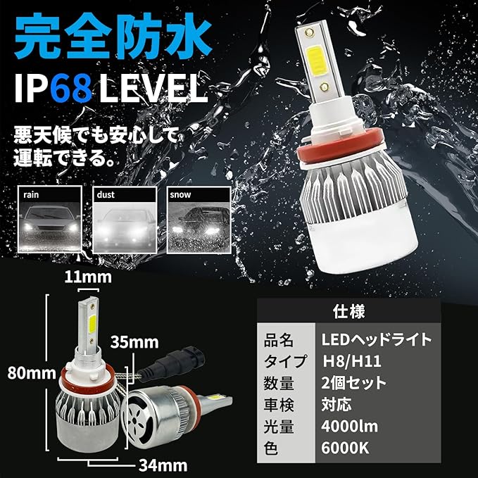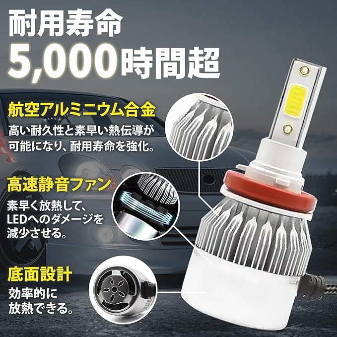 6000Kホワイト、2個、12-24V、40W、4000㏐(対応:H8、H11)、COB技術採用で輝度2倍増、安全なグレアコントロール、5,000時間以上の輝き