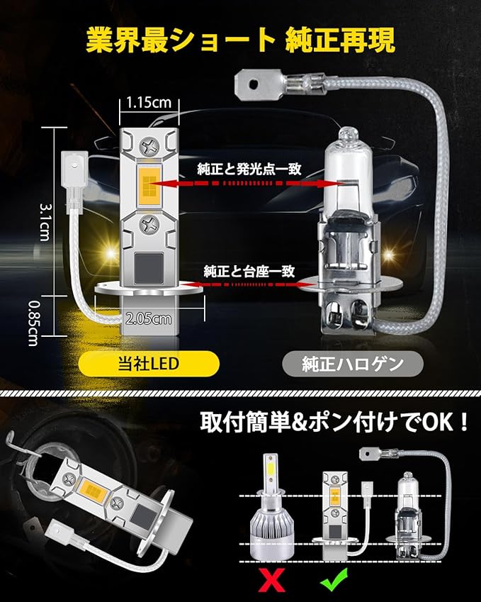 ⚡簡単取り付け・純正交換タイプ:加工不要のポン付け設計で、純正ハロゲンから簡単に切替可能。12V車だけでなく、トラックなどのH3 LED 24Vにも対応。