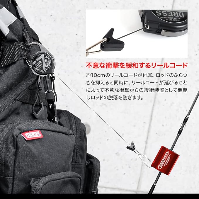 付属リールコードは約11㎝に設定しロッドのぶらつきを抑えると同時に緩衝装置として機能しロッドの脱落を防ぎます。