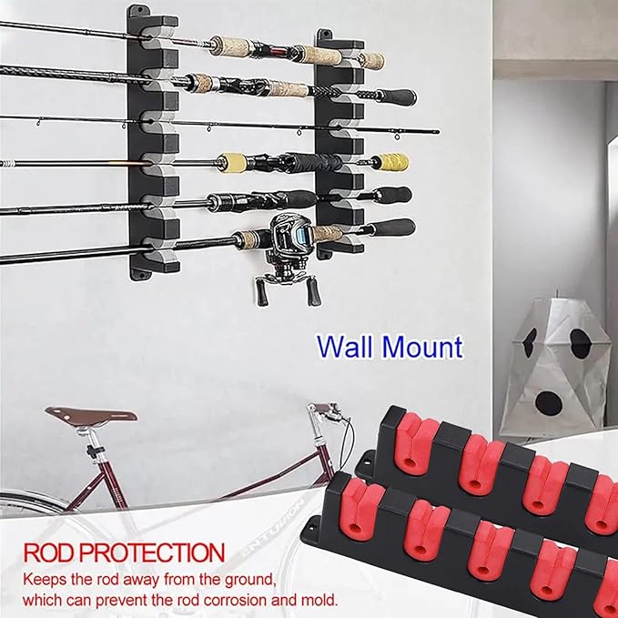 壁掛けタイプのロッドスタンドです。釣り竿を6本収納できます。横置き型、縦置き型の2スタイルをご用意致しました。大切な釣り竿をスッキリ、オシャレに収納できる釣り竿ラックです。ネジ4本、アンカー4本を付属しておりますので直ぐ取付けいただけます。