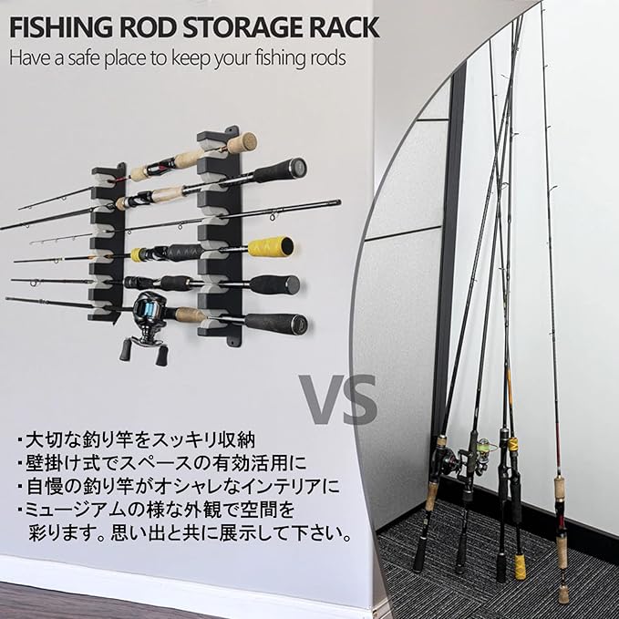 釣り竿の本数が増え置き場所に困ったり雑多になったりしていませんか。この釣り竿ラックは壁掛け式でスペースを有効活用し大切な釣り竿をスッキリと収納します。このロッドスタンドは機能性はもとより、大切な釣り竿を壁掛け収納することでオシャレなインテリアと変わります。まるで釣り竿ミュージアムの様な外観で空間を彩ります。フィッシングの楽しい思い出と共に大切な釣り竿を収納展示してください。