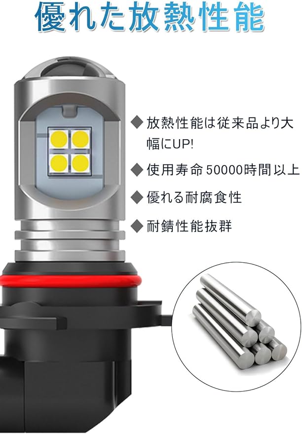耐熱抜群 長寿命:この9006 ledフォグランプ は本体は耐熱性と放熱性に優れたアルミ素材と専用なガラスファイバー基板を使用する事により、チップの使用寿命を長引かせる事が可能となりました。このh11 ledフォグランプ本体は耐熱性と放熱性に優れたアルミ素材と専用なガラスファイバー基板を使用する事により、チップの使用寿命を長引かせる事が可能となりました。