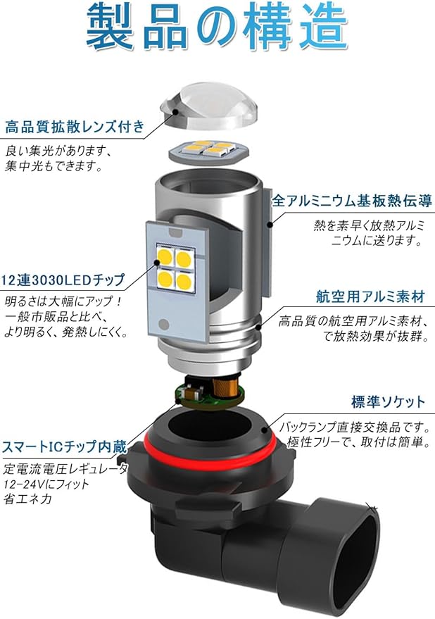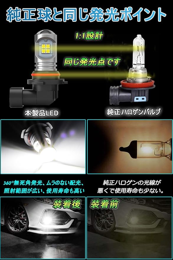 超高輝度 全方位照射:このhb4 led フォグ は超高発光効率の3030SMD LED素子12連搭載。上部は4連、周りは8連、拡散レンズ付きで光線を集中でき、照射距離を増やせる、本気の360 全方位照射でき。市販のハロゲンより省エネルギーの上で、明るさは大幅にアップ!