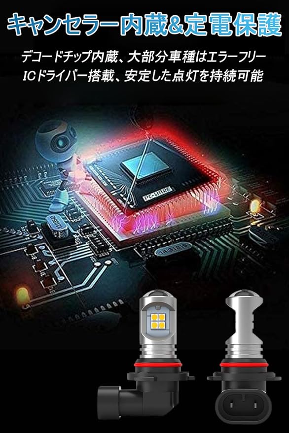 定電流回路 安定性抜群:このhb4 led フォグランプ はインテリジェント定電流回路を搭載。車両電圧変化にも影響されずに安定した点灯を持続します。これによりLEDにかかる負荷をおさえ、より長寿命を実現しております。ハイブリッド車両にも安心してご使用いただけます。