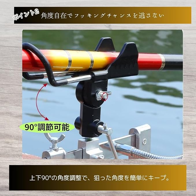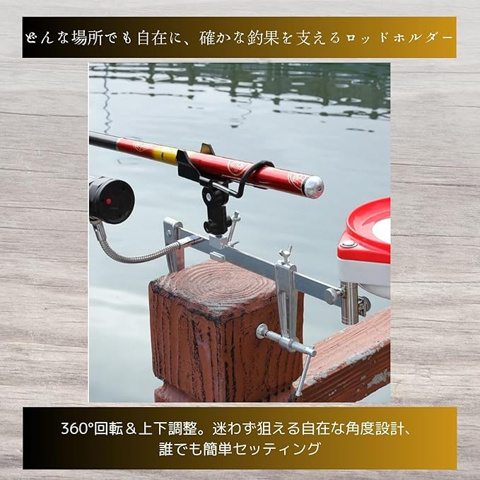 全方向回転で狙いピッタリ 360 回転機構で、魚影や流れの変化にも即座に対応できる柔軟性。 角度自在でフッキングチャンスを逃さない 上下90 の角度調整で、狙った角度を簡単にキープ。 設置カンタン、工具不要 クランプ式だからすぐに固定・解除可能。船・堤防・柵など、どこでもスムーズに設置。 様々な釣りスタイルに対応 投げ釣り、サビキ釣り、船釣りなど、状況に応じて柔軟に活用できる汎用性。