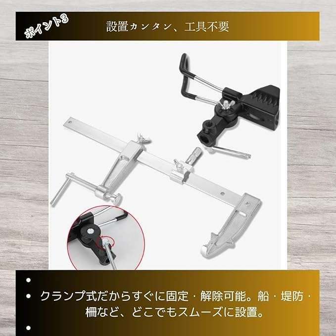 クランプ式だからすぐに固定・解除可能。船・堤防・柵など、どこでもスムーズに設置。