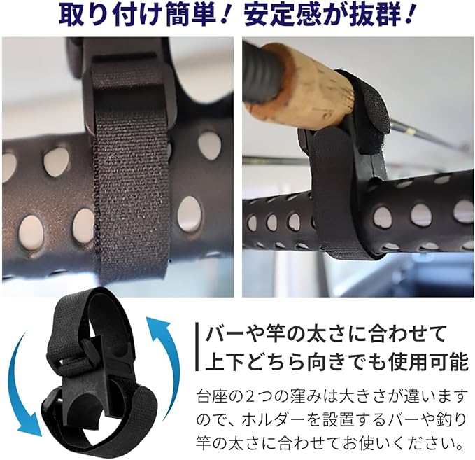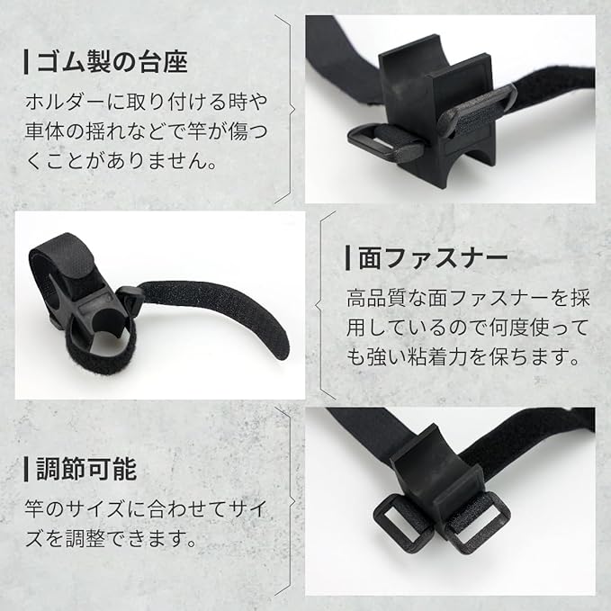 【面ファスナータイプで取り付け取り外し簡単】面ファスナータイプのベルトとゴム台座で取り付け取り外しが工具不要で簡単に出来ます。 釣り竿やバーの太さに合わせて調節を簡単にできます。 高品質な面ファスナーを採用していますので何度着脱しても粘着力が長続きします。 台座の窪みよりも細い竿先等を固定する際は面ファスナーの隙間に挟んで固定するのがおすすめです。