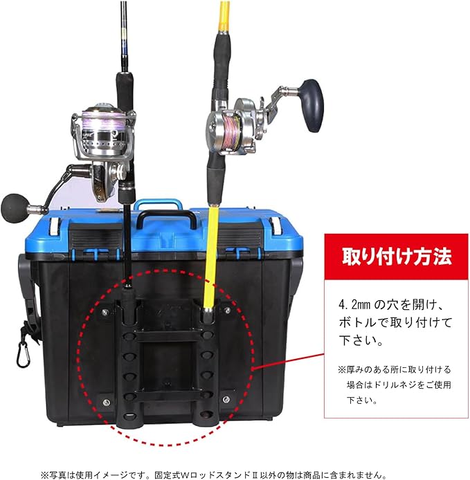 タカ産業 固定式WロッドスタンドⅡ。好評の固定式Wロッドスタンドが新色ブラックとして登場!ロッドはもちろんのこと、「魚つかみっ子」なども収納可能!ライトジギングやエギング等、持ち運びにチョイ置きに重宝します!クーラーボックスやドカットにも取り付け可能!ネジ4個付き。※クーラーボックスに取り付ける場合は、ドリルネジを購入してください。取付方法。4.2mmの穴を開けボルトで取り付けてください。※厚みのある所に取り付ける場合はドリルネジをご使用ください。用途に合わせて底板取り外し可能!