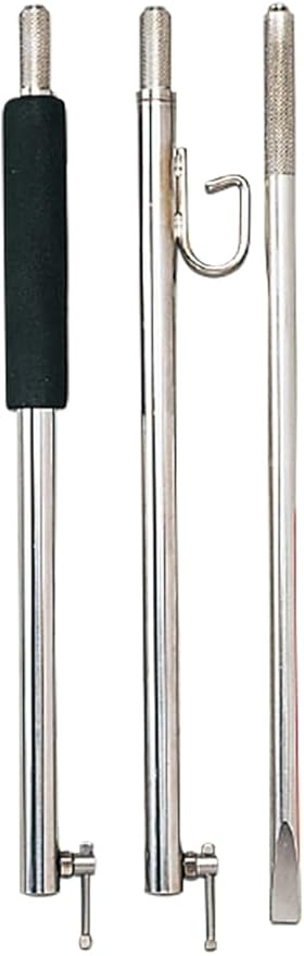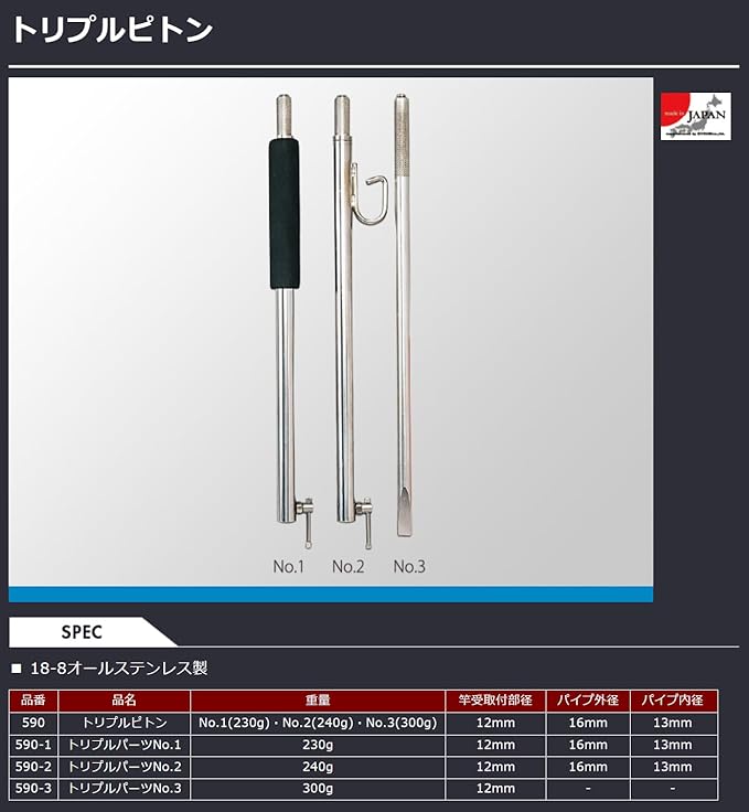 オールステンレス製で竿受はコンパクトに折れ、ピトンはパイプの中に収納できます。持ち運び、収納に便利なケース付きです。