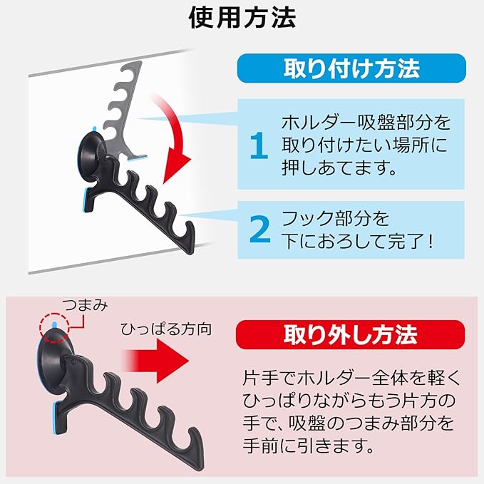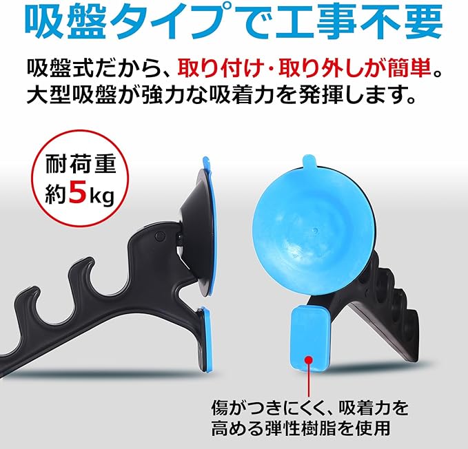 【注意】吸盤は完全に平滑で乾燥した表面にのみ使用してください。表面のほこり、油分、水滴は取り除いてから取り付けてください。耐荷重(約5kg)を超える使用はお控えください。耐荷重を超えると吸盤が外れる可能性があります。取り付け時および使用中は定期的に吸着力が低下していないか確認し、必要に応じて再度固定してください。直射日光の当たる場所や高温になる場所での使用は避けてください。材質が変形する恐れがあります。