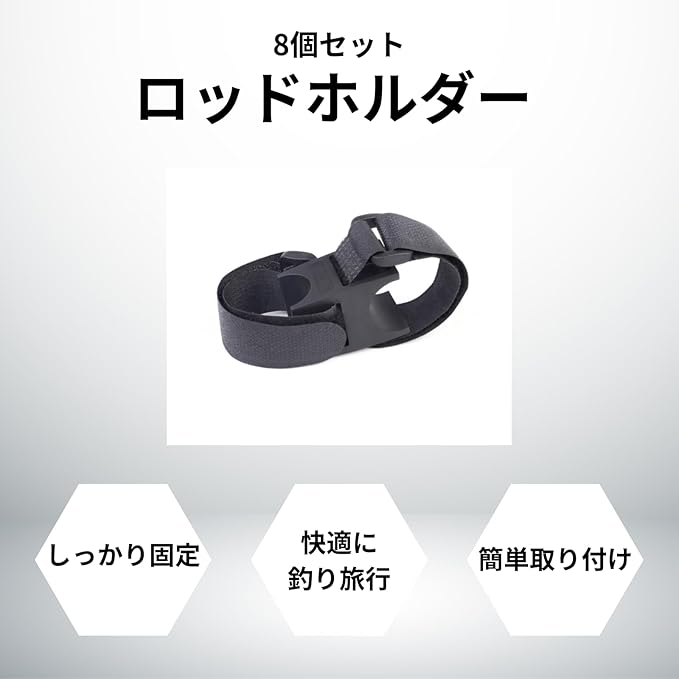 【商品内容】 ロッドホルダー : セット : 8個セット : カラー : ブラック : サイズ : 直径40mmまで対応【製品サイズ】ベルト全長:約23cm、台座の高さ:約4cm、台座の大きい窪み:約2.4cm、小さい窪み:約1.8cm【重量】約20g