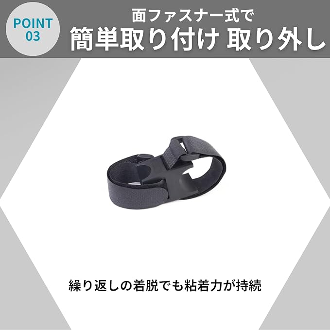 【面ファスナー式で簡単取り付け・取り外し】面ファスナー付きベルトとゴム台座で、工具不要で簡単に取り付け・取り外しが可能。釣り竿やバーの太さに合わせて手軽に調節できます。高品質な面ファスナーを使用しているため、繰り返しの着脱でも粘着力が持続します。台座の窪みより細い竿先は、面ファスナーの隙間に挟んで固定するのがおすすめです。