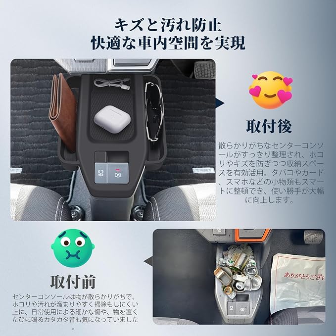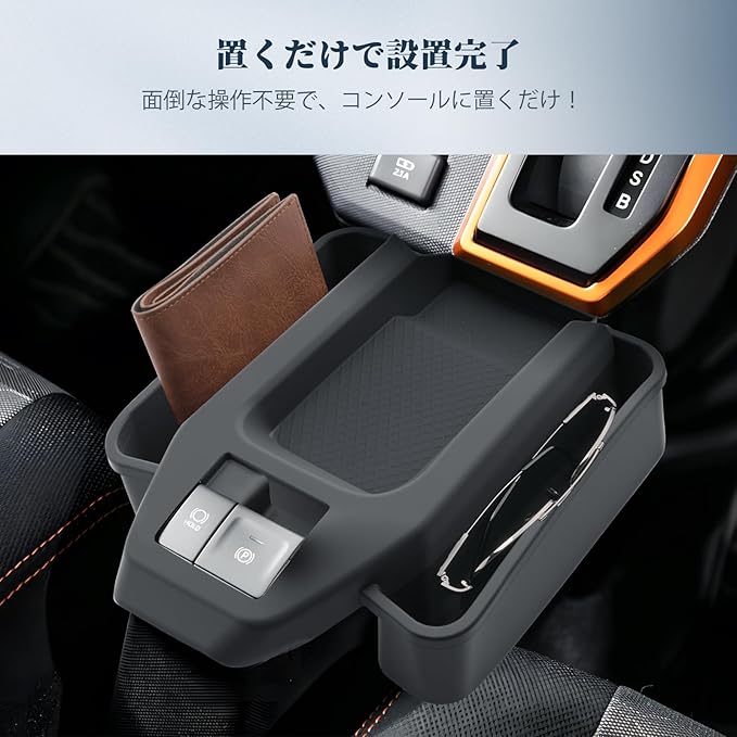 【収納スペースがUP!】スマホやティッシュ、サングラスなどの小物を収納可能。滑り止め加工済みのラバーマットで、防塵・防キズ・カタカタ異音を減少し、使いやすくて綺麗な車内を実現します。コンソールにより広い収納スペースを増設し、より便利で快適な車内空間を実現します。