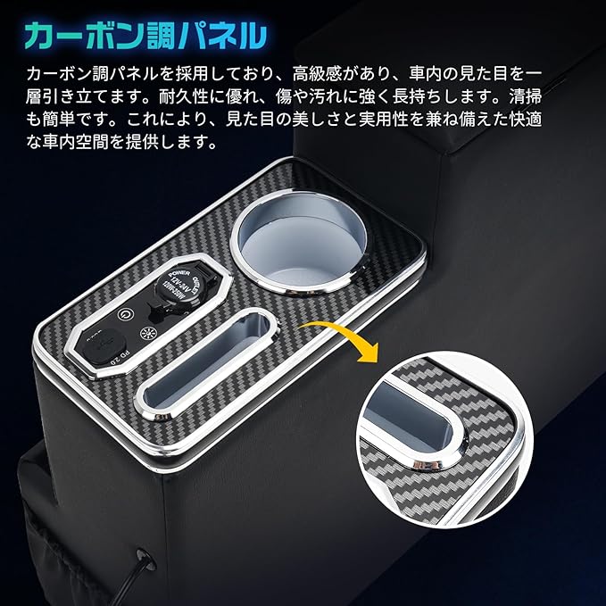 【高速充電:Type-C&QC3.0対応】アームレストにType-CポートとQC3.0 USBポートを搭載。スマートフォンやタブレットの同時充電が可能で、長距離ドライブや家族旅行中にも安心。複数デバイスを扱う営業車・配送業ユーザーにも重宝される設計です。