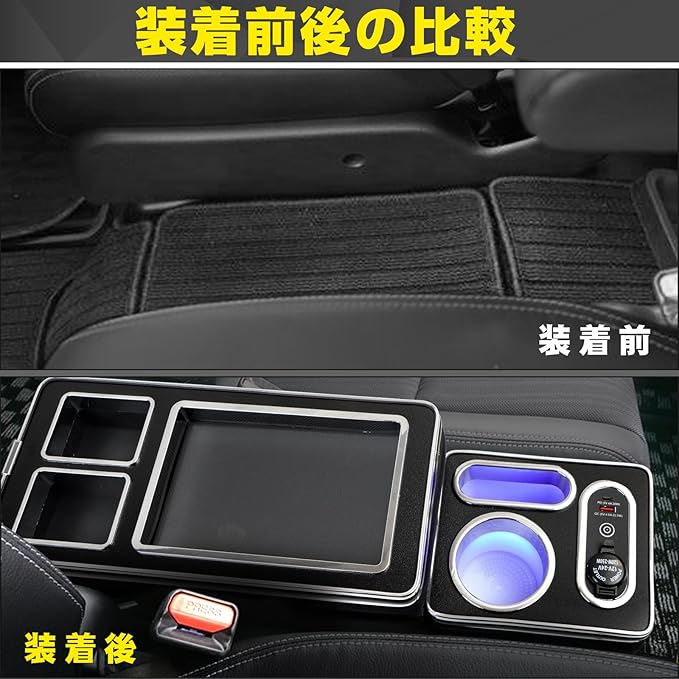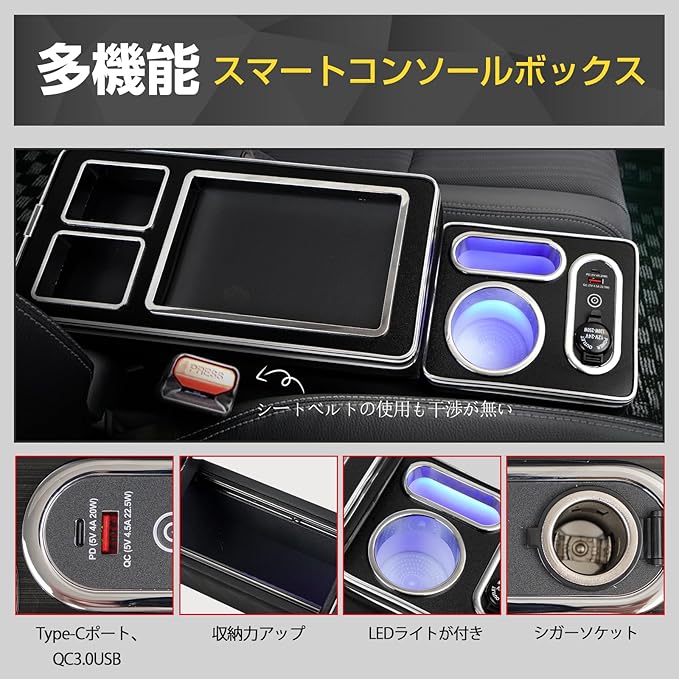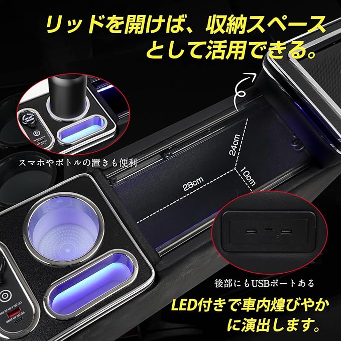 【完璧な配置】電源ソケット、QC3.0 USBポート、Type-cポート、シガーソケット、LEDスイッチなどのコントローラーが配置されています。この他、様々なドリンク容器に対応したドリンクホルダーとスマホホルダーもセンターコンソールには集約され、ドリンクのほかにスマートフォンや小物等を置くことができます。